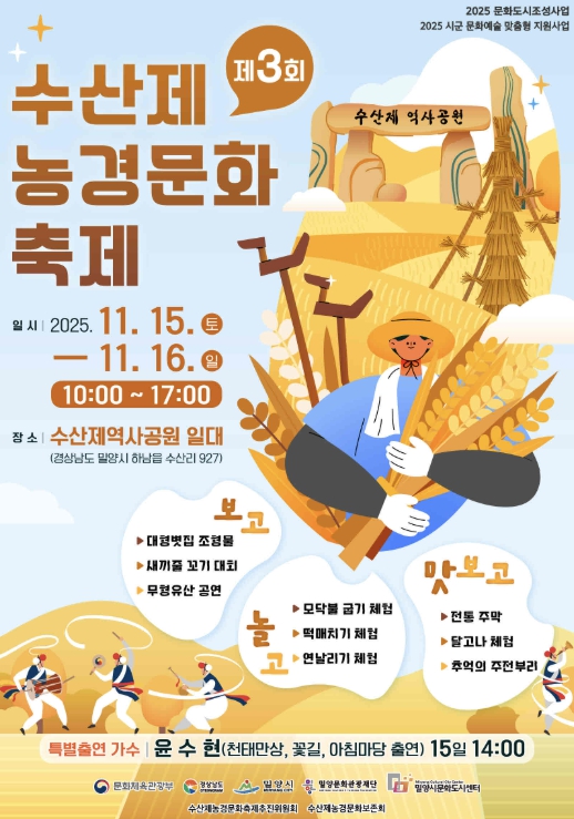 [파이낸셜경제=김예빈 기자] 경남 밀양시는 오는 15일부터 16일까지 양일간 우리나라 대표 3대 수리시설인 수산제 역사공원에서 ‘제3회 수산제 농경문화축제’를 개최한다고 11일 밝혔다.