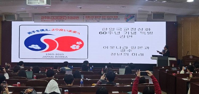 이번 강연은 ‘이웃나라의 이해와 경주 청년의 미래’를 주제로, 글로벌 시대를 살아가는 청년들에게 필요한 세계시민의 자질을 모색하고 한일 양국의 지속 가능한 협력 방향을 함께 논의하기 위해 마련됐다.