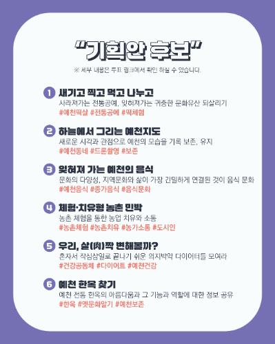 [파이낸셜경제=김지훈 기자] 예천군과 (재)예천문화관광재단은 ‘문화특화지역 조성사업’의 일환으로 운영된 문화기획학교 '문화, 배울 수(水) 있지' 2기의 결과물인 문화기획 아이디어 제안 6건을 대상으로 한 공개투표를 오는 24일까지 진행한다고 밝혔다.