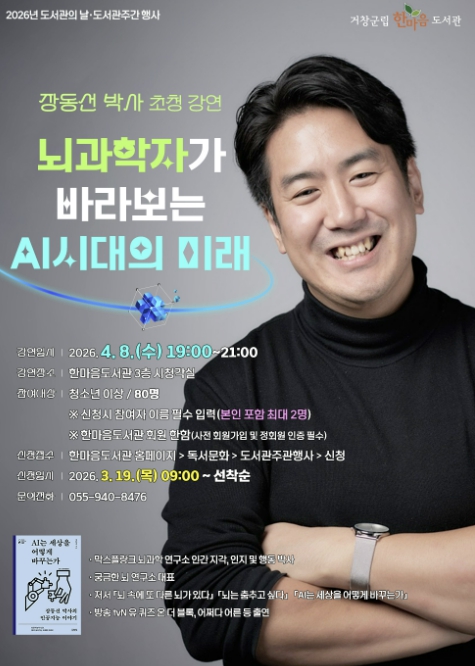먼저 오는 4월 8일 오후 7시 장동선 박사 초청 강연이 열린다. ‘뇌과학자가 바라보는 AI 시대의 미래’를 주제로, 급격한 기술 변화 속에서 인간의 뇌가 어떻게 적응하고 발전해야 하는지 살펴보고 인공지능과 공존하는 미래 사회에 필요한 핵심 역량에 대해 이야기할 예정이다. 명쾌하고 재치 있는 설명으로 군민들에게 과학과 인문학이 어우러진 통찰의 시간을 전할 것으로 기대된다.