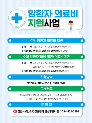 '암환자·희귀질환자 의료비 지원사업' 신청을 원할 시 진단서 등 지원 내용에 따른 구비서류를 갖춰 김천시 보건소 건강증진과로 방문 신청하면 된다.
