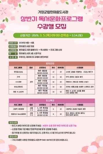 [파이낸셜경제=김예빈 기자] 거창군 한마음도서관은 오는 3월 5일부터 군민들의 지적 욕구를 충족시키고 문화적 소양을 높이기 위한 ‘상반기 독서문화 프로그램’ 수강생을 모집한다.