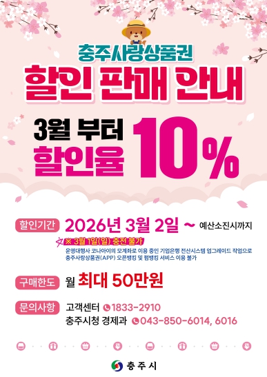 시 관계자는 “2월 특별할인 기간 동안 시민들의 관심과 참여로 충주사랑상품권 이용이 활발히 이루어지며 지역경제에도 긍정적인 활력이 더해졌다”며 “앞으로도 안정적인 할인정책 운영을 통해 소비 촉진과 소상공인 지원에 최선을 다하겠다”고 말했다.