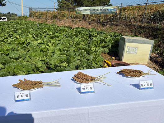 평가회는 기존 재배 품종인 청차조 ‘삼다찰’과 재래품종 ‘황미찰조’, 신품종 ‘아리찰’의 이삭 현장 연시로 시작됐으며 참석자들은 ‘아리찰’ 재배 포장에 직접 들어가 생육 상태와 품질을 확인했다.
