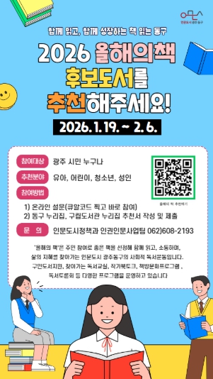 [파이낸셜경제=김예빈 기자] 광주 동구는 한 해 동안 시민과 함께 읽을 2026년 ‘책 읽는 동구 올해의 책’ 선정을 위해 후보 도서 추천을 오는 2월 6일까지 접수한다고 밝혔다.