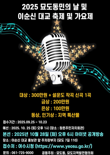 이상로 묘도동장은 “올해 30회를 맞는 묘도동민의 날과 함께 이순신대교 축제, 그리고 새롭게 선보이는 이순신대교 가요제를 통해 주민들이 하나로 어우러지고 더 나아가 전국적인 문화·관광 축제로 성장해 나가기를 기대한다”고 말했다.