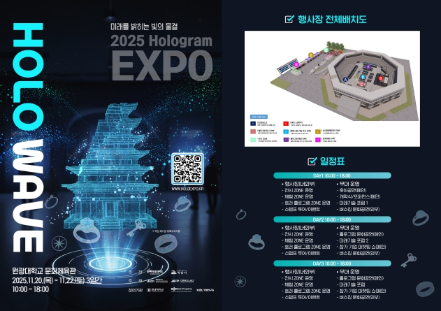 [파이낸셜경제=김예빈 기자] (재)전북특별자치도 콘텐츠융합진흥원(원장 김성규)은 ‘2025 홀로그램 엑스포 HOLO WAVE’가 오는 11월 20일부터 22일까지 3일간, 오전 10시부터 오후 6시까지 익산 원광대학교 문화체육관에서 개최된다고 밝혔다.