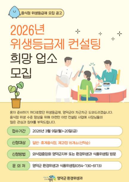 [파이낸셜경제=김지훈 기자] 영덕군은 지역 음식점의 위생 수준을 높이고 외식 환경의 경쟁력을 강화하기 위해 올해 ‘음식점 위생 등급제 컨설팅’ 사업에 참여 업소를 오는 9일부터 20일까지 선착순으로 모집한다.