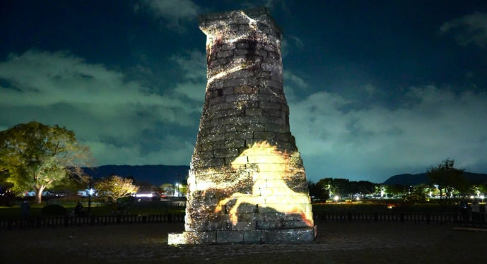 | ▲ 첨성대 외벽에 황금빛 말의 영상이 투사된 미디어파사드 장면. |