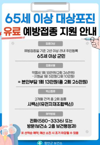 접종 대상은 예방접종일 기준으로 2년 이상 관내 주민등록을 두고 거주한 65세 이상 주민이다.