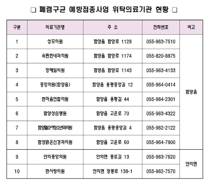 함양군의 관내 참여 의료기관은 10개소이며, 또한 관내 보건기관(보건소, 보건지소 및 보건진료소)에서도 접종이 가능하나, 보건기관에서 접종을 원할 경우는 접종 가능 여부를 사전에 꼭 확인하고 방문하기를 권장하고 있다.