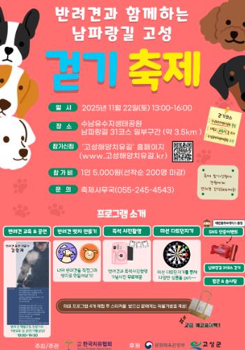 [파이낸셜경제=김예빈 기자] 고성군은 오는 11월 22일, 수남유수지 생태공원과 대독누리길 일원에서 ‘반려견과 함께하는 남파랑길 고성 걷기축제’를 개최한다고 밝혔다.