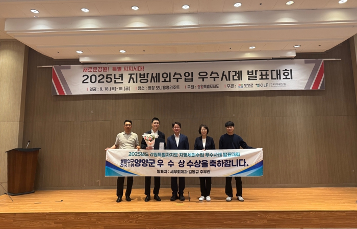 [파이낸셜경제=조성환 기자] 양양군은 지난 9월 19일 강원도 평창 모나 용평리조트에서 열린 ‘2025 지방세외수입 우수사례 발표대회’에서 신규수입원발굴 부문 우수상을 수상했다.