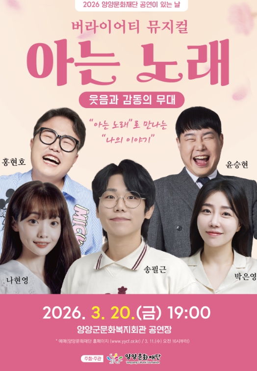 [파이낸셜경제=조성환 기자] (재)양양문화재단이 2026년 새해 첫 공연으로 온 가족이 함께 웃고 즐길 수 있는 개그 뮤지컬 '아는 노래'를 오는 3월 20일 오후 7시 양양군 문화복지회관 공연장에서 개최한다.