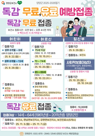 양양군보건소 관계자는 “독감 예방접종은 어린이, 임신부, 어르신 모두에게 독감으로 인한 질병 부담을 줄이고, 입원과 사망을 예방하는 데 매우 효과적인 수단"이라며, 올겨울 유행에 대비해 반드시 예방접종을 받을 것을 당부했다.