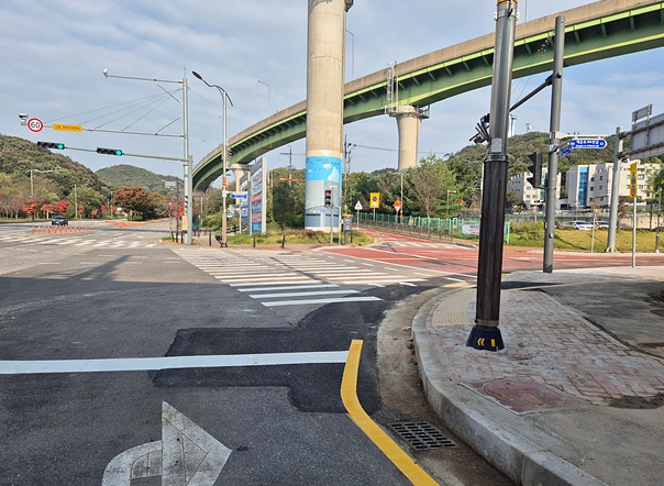 구체적으로 신호등과 가로등을 이설하고, 가각부에 있는 보도를 약 1m 축소함으로써, 버스 차량이 진입하는 데 불편함이 없도록 조치했다.