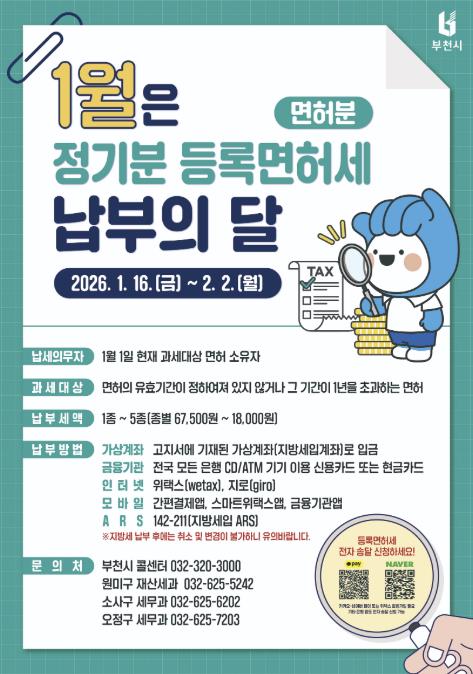 이점숙 부천시 세정과장은 “등록면허세는 해마다 1월에 부과되는 정기 세목으로, 납부 기한을 놓치면 가산세가 발생할 수 있다”며 “앞으로도 다양한 납부 방법과 사전 안내로 납세 편의를 높이겠다”고 말했다.