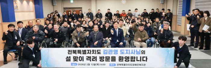 도는 12일 설 명절을 앞두고 전북장애인복지관을 방문해 공적 항공마일리지를 활용해 마련한 생활필수품을 전달하고, 복지관 종사자와 이용 장애인들을 격려했다.