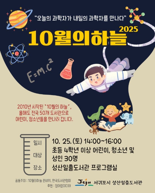[파이낸셜경제=김영란 기자] 서귀포시성산일출도서관은 오는 10월 25일 오후 2시부터 4시까지 과학자들의 재능기부로 진행되는 전국 과학 강연 행사 ‘10월의 하늘’을 운영한다.