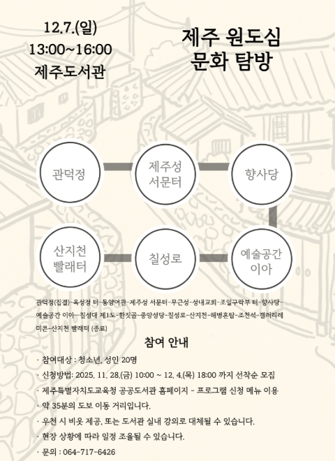 또한 ‘제주의 역사를 지켜본 관덕정 이야기’를 시작으로 ▲북두칠성 유래가 담긴 칠성로 ▲남문로와 이앗골 등 오래된 골목 이야기 ▲제주 사람들의 삶을 관통하는 산지천 ▲원도심 속 제주4·3의 흔적 등을 차례로 둘러보며 예혁 전문문화해설사가 강사로 동행해 깊이 있는 해설을 제공할 예정이다.