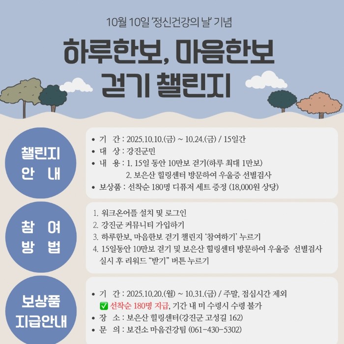 [파이낸셜경제=김예빈 기자] 강진군보건소가 지난 10일 정신건강의 날을 기념해 군민 마음 건강을 위한 ‘하루 한보, 마음 한보 걷기 챌린지’를 운영중이다.