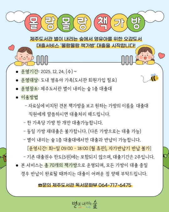 [파이낸셜경제=김영란 기자] 제주도교육청 제주도서관은 24일부터 영유아 오감도서 대출 서비스 ‘몰랑몰랑 책가방’을 운영한다.