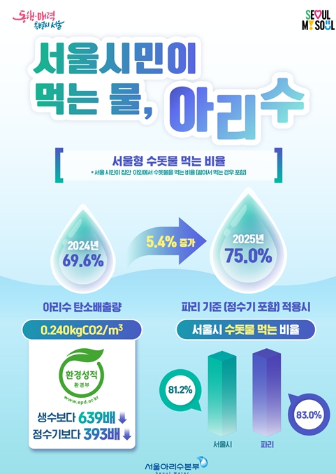 서울시가 서울시민 1,000명을 대상으로 실시한 ‘2025년 서울시민 먹는 물 소비패턴 조사’ 결과, 수돗물을 ‘먹는 물’로 이용하는 시민은 75%로 지난해보다 5.4%p 증가했으며, 만족도와 인식, 브랜드 체감도 등 수돗물 이용 전반에서 긍정적인 변화가 나타났다고 밝혔다.