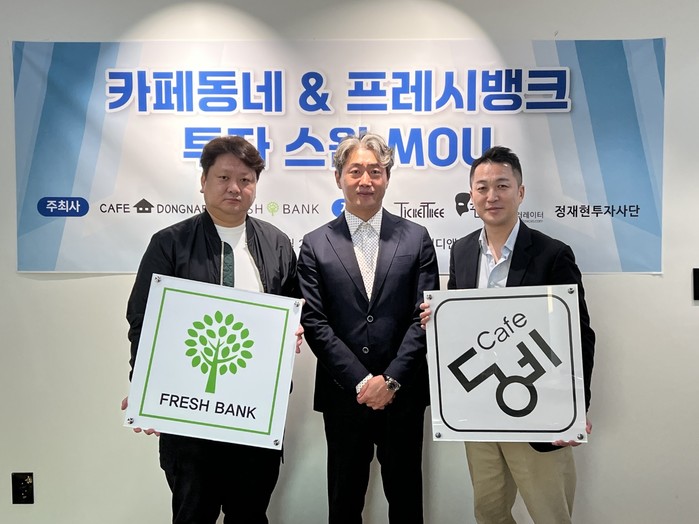 | ▲카페동네 이상근 대표, 팬텀엑셀러레이터 김세훈 대표 엑셀러레이터, 프레시뱅크 김성균 대표 (왼쪽부터) |