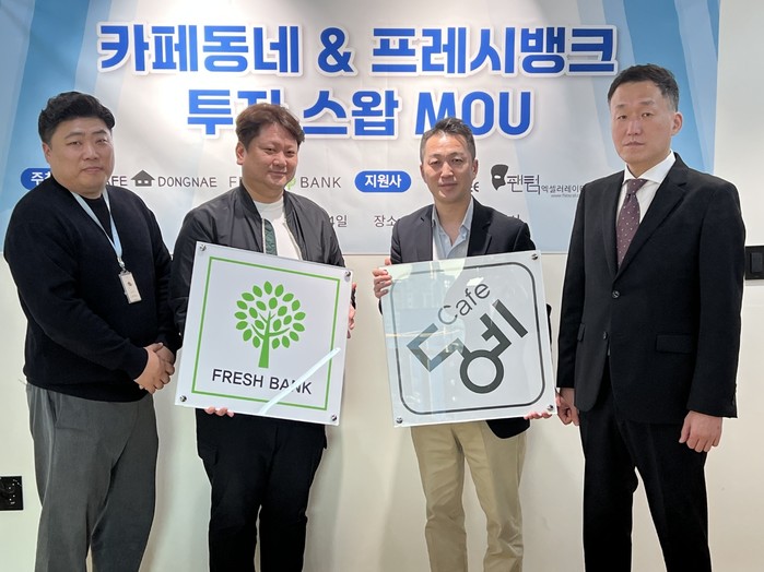 | ▲카페동네 권법인 이사, 이상근 대표, 프레시뱅크 김성균 대표, 차영재 이사 (왼쪽부터) |