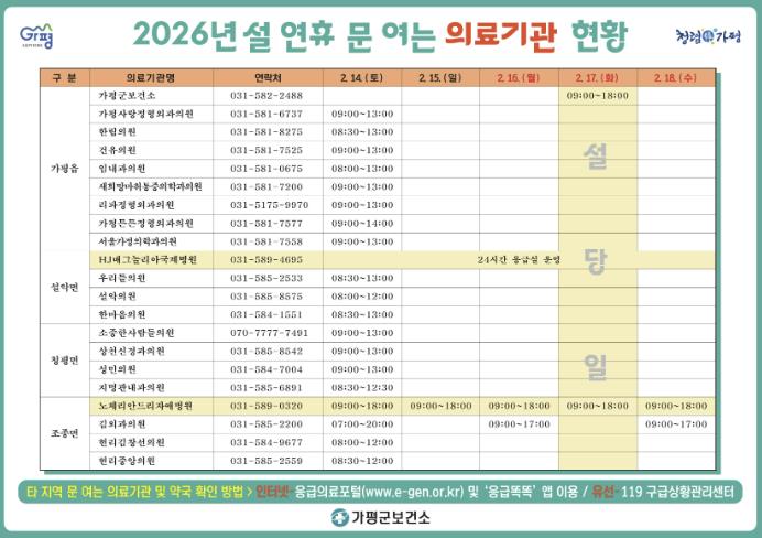 아울러 가평군은 설 연휴 동안 운영하는 의료기관, 약국 정보를 사전에 안내하고 있다. 연휴 기간 문을 여는 의료기관 및 약국 정보는 △가평군청 및 가평군보건소 홈페이지 △119구급상황관리센터 △응급의료포털 △보건복지콜센터에서 확인할 수 있다.