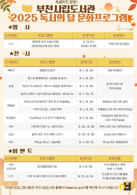 특히 9월 13일 부천시청 잔디광장에서 열리는 ‘제25회 부천 북 페스티벌’은 ‘독파민 팡팡! 놀러나온 도서관’을 주제로 시민 누구나 즐길 수 있는 부천 대표 책 축제로 진행된다. 본 행사에서는 부천의 책 만화분야 ‘노인의 꿈’의 ‘백원달’ 작가 강연과 북콘서트, 다채로운 독서 체험 부스, 테마 전시, 인형극, 어린이 체험 프로그램 등 다양한 프로그램이 마련될 예정이다.