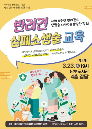 제천시립도서관 관계자는 “국제 강아지의 날을 기념해 반려동물의 생명을 지킬 수 있는 실질적인 교육을 준비했다”라며 “반려인뿐만 아니라 반려 문화에 관심 있는 시민 여러분의 많은 참여를 바란다”라고 전했다.