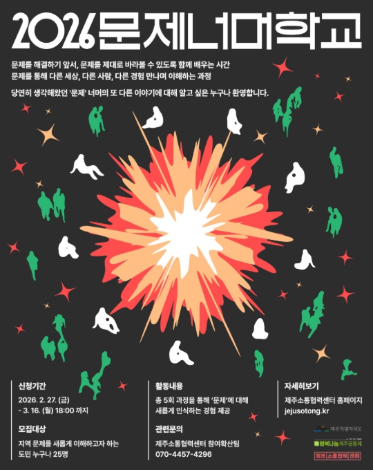[파이낸셜경제=김영란 기자] 제주특별자치도와 제주특별자치도 소통협력센터가 도민 주도의 지역문제 탐구를 지원하는 교육 프로그램 ‘2026 문제너머학교’를 운영하고, 27일부터 3월 16일까지 참여자를 선착순으로 모집한다.
