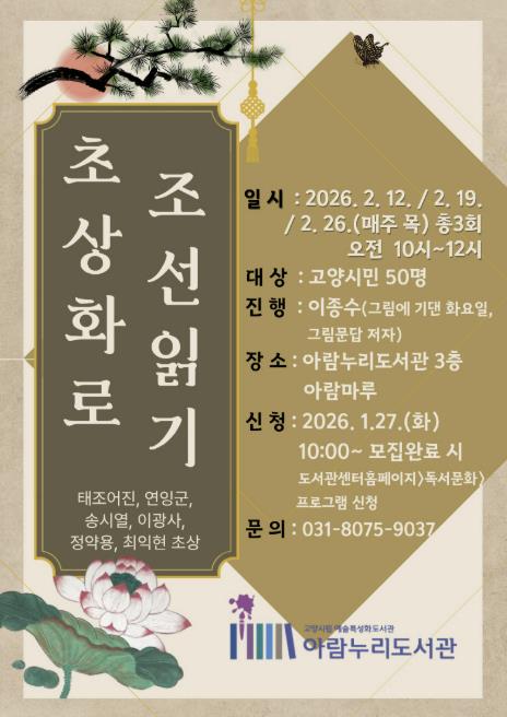 최경숙 일산동구도서관과장은 “초상화라는 시각적 매체를 통해 조선 인물과 시대를 흥미롭게 읽어볼 수 있는 뜻깊은 시간이 될 것”이라며 “역사와 미술을 함께 경험하고 싶은 시민들의 많은 참여를 바란다”라고 전했다.