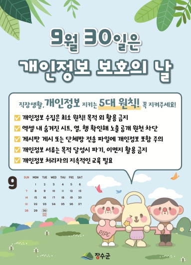 [파이낸셜경제=김예빈 기자] 장수군은 2025년 개인정보보호의 날(9월 30일)을 맞아 개인정보보호의 중요성을 널리 알리기 위해 23일부터 30일까지 ‘개인정보 보호주간’을 운영한다고 밝혔다.