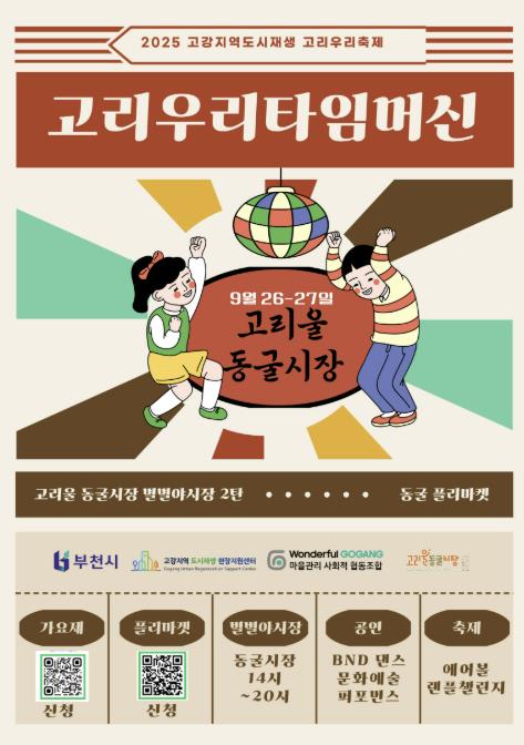 [파이낸셜경제=김기보 기자] 부천시는 9월 26일부터 27일까지 이틀간 오정구 고리울 동굴시장에서 ‘2025 고리우리축제’를 연다고 23일 밝혔다. 이번 행사는 부천시 원도심재생과가 주최하고 원더풀고강마을관리 사회적협동조합이 주관한다.