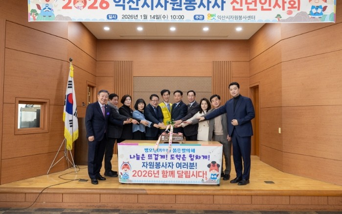 시는 14일 송학동 행정복지센터 대회의실에서 '2026년도 익산시 자원봉사자 신년인사회'를 개최하고, 자원봉사자들과 함께 새해 자원봉사 실천 의지를 다졌다.