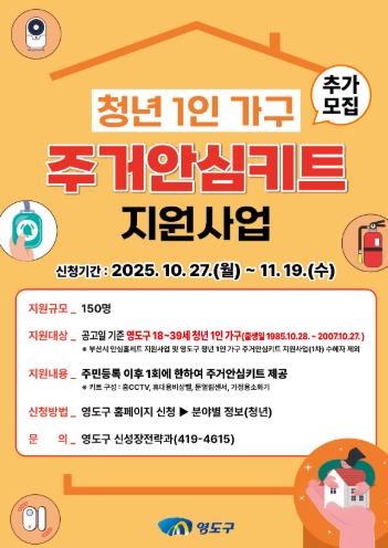 [파이낸셜경제=박영진 기자] 부산 영도구는 지역 내 청년 1인 가구의 주거 안심도를 높이고 사회적 고립감을 해소하는 등 안전한 주거환경을 조성하고자 ‘청년 1인 가구 주거안심키트 지원사업’을 1차에 이어 2차로 추가 모집에 나선다.