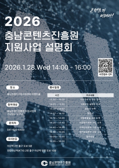 [파이낸셜경제=김영란 기자] (재)충남콘텐츠진흥원(원장 김곡미)은 오는 1월 28일 오후 2시, 충남콘텐츠기업지원센터 이벤트홀에서 ‘2026년 지원사업 설명회’를 개최한다고 밝혔다.