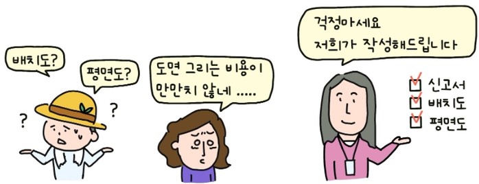 무료 작성되는 설계도서는 가설건축물 축조신고서, 배치도, 평면도로 구성되며 신청 대상은 20㎡ 이하 규모의 농막을 가설건축물로 축조 신고하고자 하는 시민이다. 단, 체류형 쉼터는 적용 대상에서 제외된다.