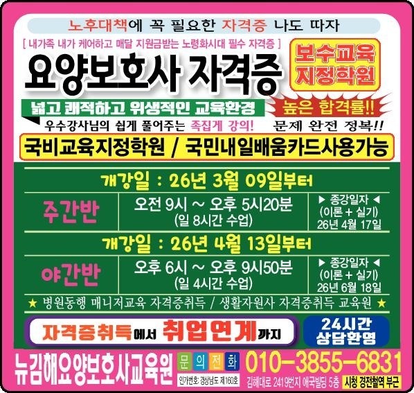 [파이낸셜경제=김지훈 기자] 경남 김해 지역을 대표하는 요양보호사 전문 교육기관 뉴김해요양보호사교육원-학원이 2026년 상반기 요양보호사 자격증 대비 과정을 개강하며 다시 한 번 지역 내 존재감을 드러내고 있다. 체계적인 커리큘럼, 높은 합격률, 철저한 수강생 관리 시스템을 기반으로 ‘믿고 선택하는 교육기관’이라는 평가를 받고 있다.