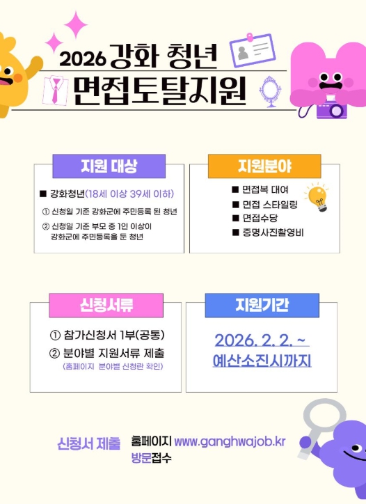 '강화 청년 면접 지원-면접 토탈 솔루션'은 2026년 취업을 준비하는 강화 청년들에게 취업 준비에 따른 비용 부담과 스트레스를 덜어주기 위해 추진됐으며, ▲증명사진 촬영비 지원 ▲면접복 대여 ▲면접 스타일링 ▲면접 수당 지원 ▲AI 자기소개서 · 면접 체험 등 다양한 프로그램으로 청년들을 맞이한다.