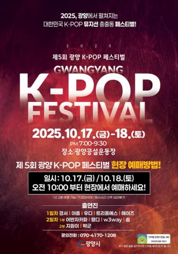 이현주 관광과장은 “제5회 광양 K-POP 페스티벌이 글로벌 명품 축제에 걸맞게 안전하고 품격 있게 치러질 수 있도록 마지막까지 철저하고 체계적인 행정력을 발휘하겠다”며 “선선한 가을밤, 음악과 열정, 감동이 어우러진 최고의 무대에 시민과 관광객 여러분의 많은 관심과 성원을 부탁드린다”고 말했다.