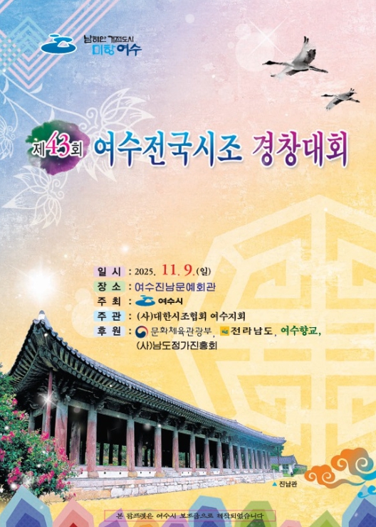 [파이낸셜경제=김예빈 기자] 여수시는 오는 11월 9일 오전 9시 진남문예회관에서 ‘제43회 여수 전국시조경창대회’를 개최한다.