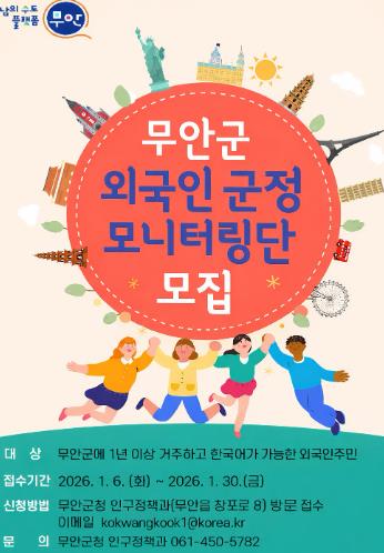 [파이낸셜경제=김예빈 기자] 무안군은 외국인주민의 안정적인 지역 정착과 사회통합을 위해 2026년 '외국인주민 군정 모니터링단'을 신규 모집한다고 밝혔다.