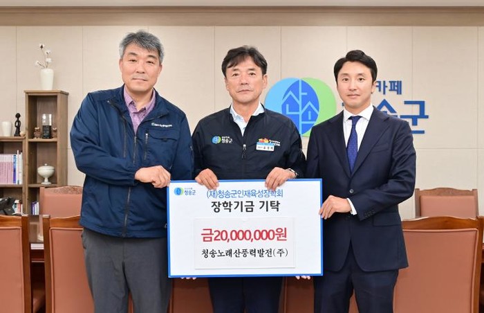 [파이낸셜경제=김지훈 기자] 청송노래산풍력발전(주)은 지난 16일 지역사회와의 상생 및 미래 인재 육성을 위해 (재)청송군인재육성장학회에 장학금 2천만 원을 기탁했다.