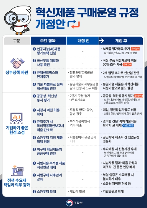 이번 개정은 연간 225조원에 달하는 공공조달시장을 전략적으로 활용하여 AI 신산업 육성 등 정부정책을 지원하는 한편, 숨은 규제를 해소하여 기업하기 좋은 환경을 조성하는 데 초점을 맞췄다.