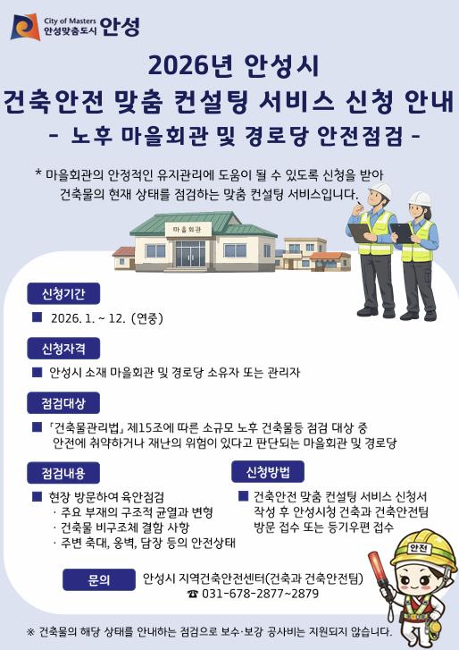 | ▲ 안성시 지역건축안전센터, ‘2026년 건축안전 맞춤 컨설팅 서비스(노후 마을회관 및 경로당 안전점검)’ 시행 |