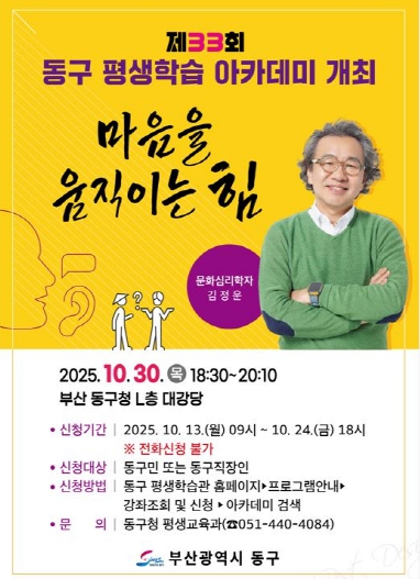 [파이낸셜경제=박영진 기자] 부산 동구는 오는 10월 30일, 동구청 층 대강당에서 문화심리학자 김정운 소장