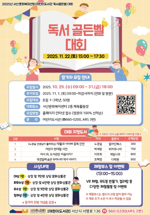 [파이낸셜경제=김영란 기자] 서산문화복지센터 어린이도서관은 책 읽는 문화 확산을 위해 2025년 독서골든벨 대회를 11월 22일 초등 1∼3학년 50명을 대상으로 서산문화복지센터 체육활동장에서 진행할 예정이다.